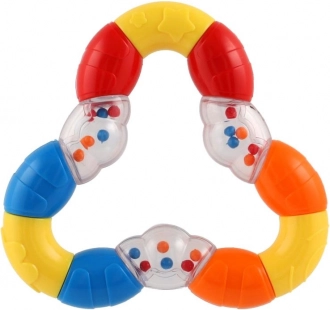 Lekka jak piórko grzechotka w kształcie trójkąta jest idealna na pierwsze zabawy niemowląt. Elastyczny plastik jest przyjemny w dotyku, łatwy do trzymania i jednocześnie służy jako gryzak.