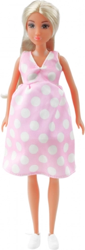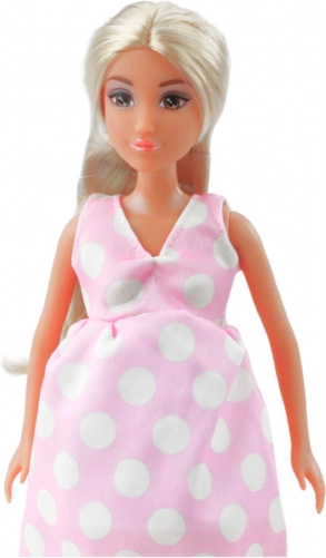 Lalka Anlily w ciąży w różowej sukience w grochy Długie włosy