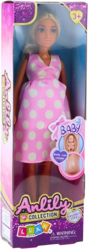 Lalka Anlily w ciąży w różowej sukience z odczepianym brzuszkiem. Idealna do kreatywnej zabawy.