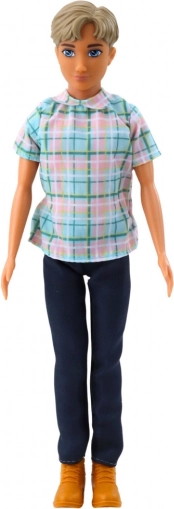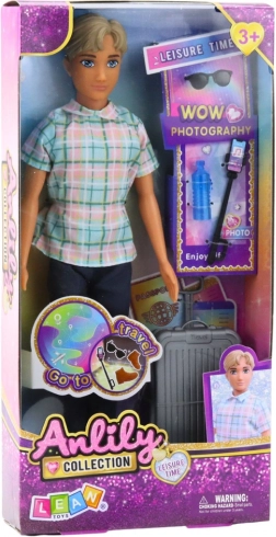 Lalka chłopiec Anlily jest ubrana w stylową koszulę w kratę, granatowe spodnie i brązowe buty. Do dyspozycji są stylowe akcesoria, takie jak szara walizka na kółkach z wysuwaną rączką, kijek do selfie z telefonem, okulary przeciwsłoneczne i butelka wody.