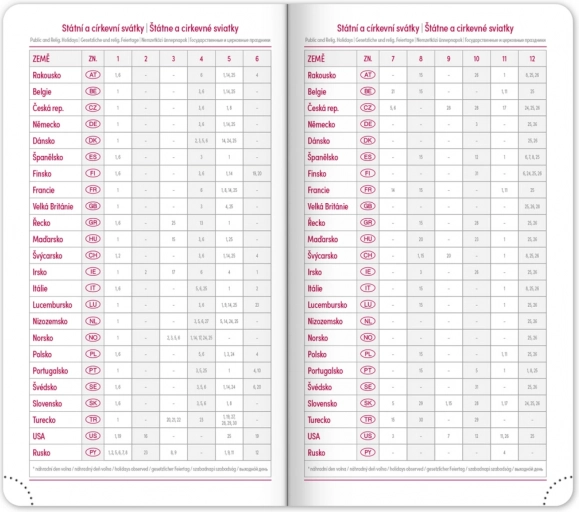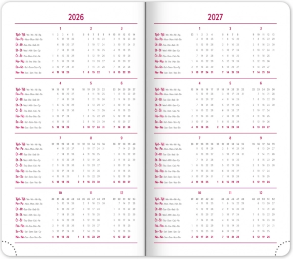 Terminarz Aprint 2026 oferuje tygodniowy plan z wielofunkcyjnym kalendarzem, który obejmuje wersje językowe czesko-słowackie, a także angielskie, niemieckie, węgierskie i rosyjskie. Zapewnia przejrzystą organizację ważnych dat i zadań.