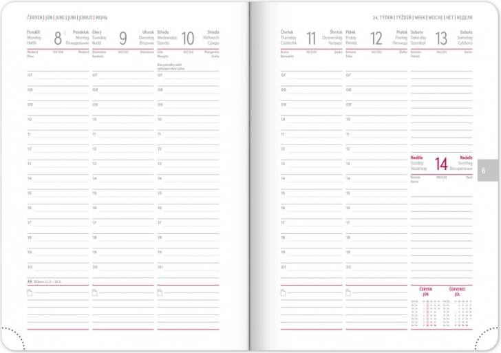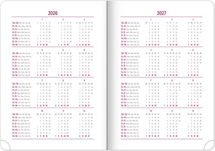 Tygodniowy terminarz Ajax 2026 to idealne rozwiązanie dla osób wymagających precyzyjnego uporządkowania swoich planów. Zawiera tygodniowy układ z kalendarzem czesko‑słowackim oraz dodatkowymi językami: angielskim, niemieckim, węgierskim i rosyjskim. Dzięki konstrukcji z elastyczną gumką i materiałową zakładką jest łatwy do przenoszenia i gotowy do codziennego użytku.