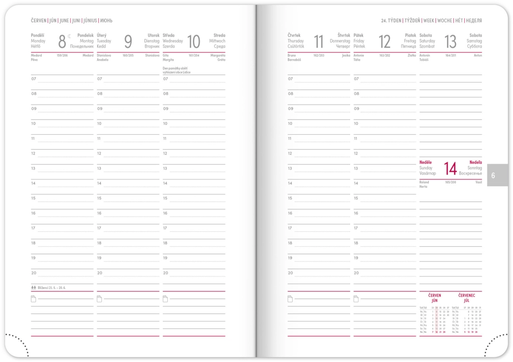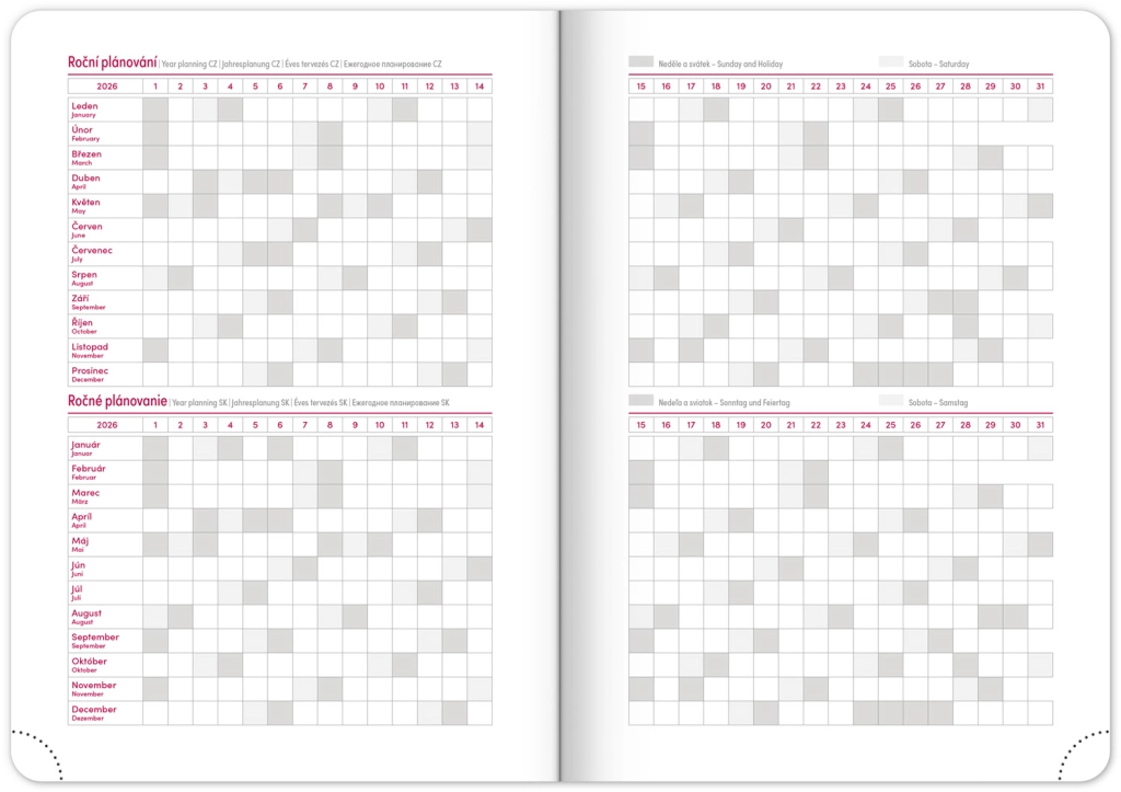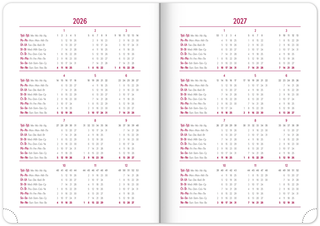 Elegancki tygodniowy terminarz Ajax 2026 w złotym kolorze z delikatnie fakturowaną powierzchnią i nietypowym reliefem to idealny towarzysz na każdy dzień. Dzięki czesko‑słowackiemu kalendarium oraz dodatkowo angielskiemu, niemieckiemu, węgierskiemu i rosyjskiemu jest praktyczny i dopasowany dla każdego.