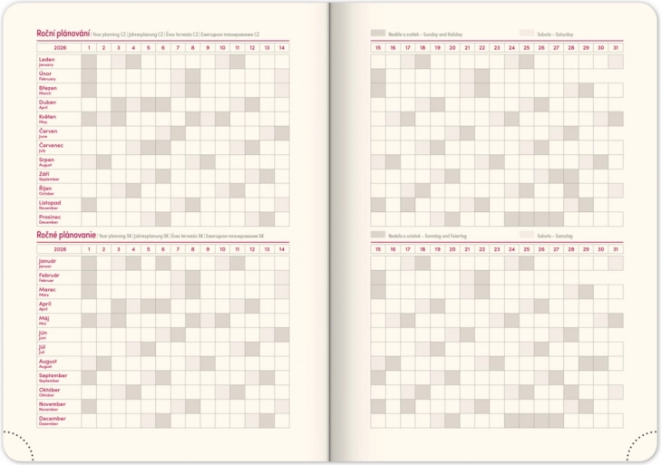 Ten terminarz to doskonały wybór dla osób szukających połączenia stylu i funkcjonalności. Wyposażony jest w zaokrąglone rogi, uchwyt na długopis oraz elastyczną gumkę dla lepszego zamknięcia. Terminarz ma układ tygodniowy i zawiera czesko‑słowackie kalendarium wraz z dodatkowymi językami, takimi jak angielski, niemiecki, węgierski i rosyjski.