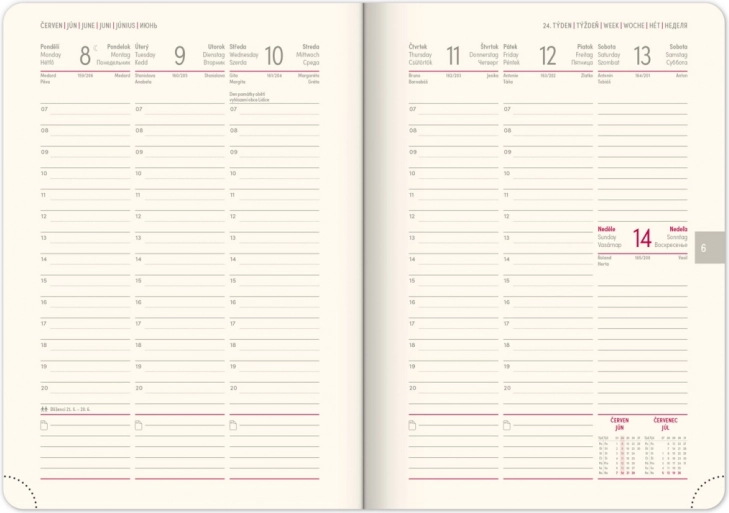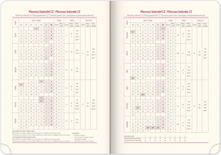 - Tygodniowy układ z kalendarium czesko‑słowackim oraz wsparciem języków: angielskiego, niemieckiego, węgierskiego i rosyjskiego.