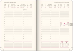 Ten tygodniowy terminarz łączy styl i funkcjonalność dzięki niebiesko‑złotej stylistyce z metalicznym wykończeniem i tłoczeniem roku. Wyposażony jest w praktyczne elementy, takie jak zaokrąglone rogi, uchwyt na długopis i elastyczna gumka, które zapewniają wygodne użytkowanie. Terminarz zawiera układ z czesko‑słowackim kalendarium oraz innymi językami, takimi jak angielski, niemiecki, węgierski i rosyjski.