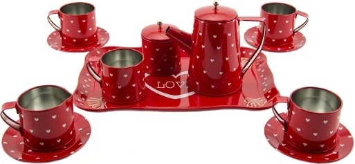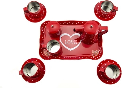 Czerwone naczynia są ozdobione białymi serduszkami, co nadaje im romantyczny i jednocześnie zabawny wygląd. Każdy element jest starannie dobrany, aby stworzyć harmonijną całość, która pobudzi dziecięcą wyobraźnię.