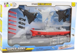 Wojskowy dziecięcy zestaw z lotniskowcem, łodzią podwodną i trzema myśliwcami dostarcza zabawy pełnej strategii, akcji i kreatywności dla małych miłośników wojska.