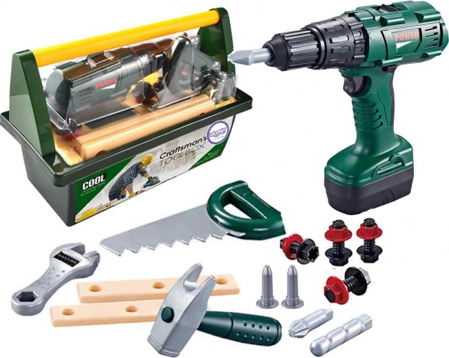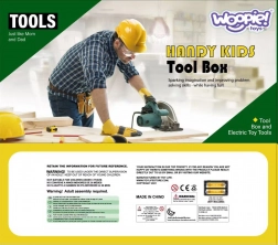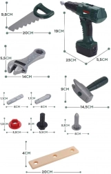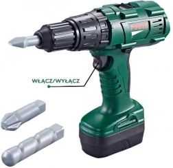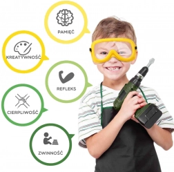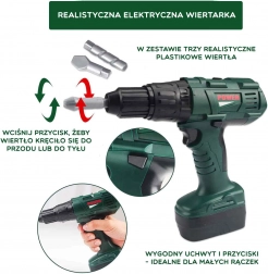 Duży zestaw narzędzi od popularnej marki Woopie zawiera praktyczną zieloną skrzynkę z narzędziami oraz 15 narzędzi, w tym bezprzewodową wiertarkę z 3 wymiennymi końcówkami, która imituje prawdziwe dźwięki i obroty.