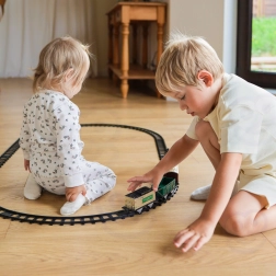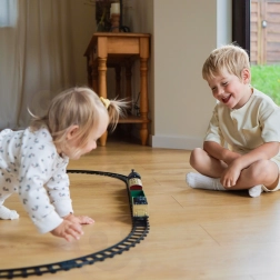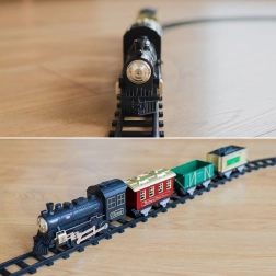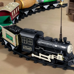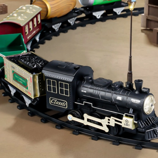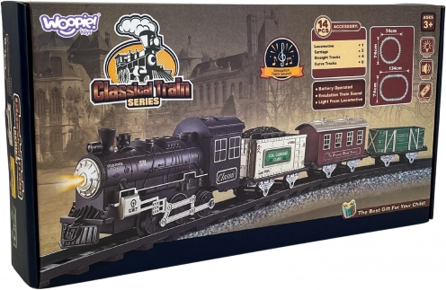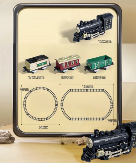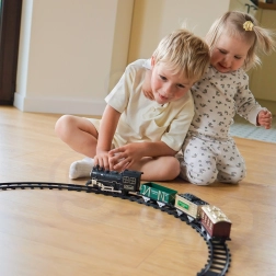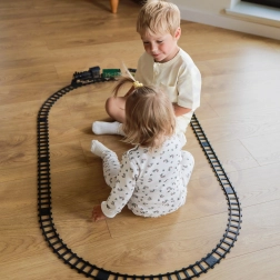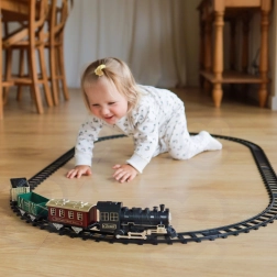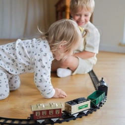Ten tradycyjny parowy zestaw pociągowy zapewnia dzieciom autentyczne wrażenia z jazdy pociągiem. Lokomotywa ma świecący reflektor i realistyczne dźwięki, które potęgują atmosferę zabawy. Tory łatwo się zatrzaskują, więc w kilka chwil zbudujesz okrąg o średnicy 74 cm lub owal 134 × 74 cm.