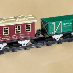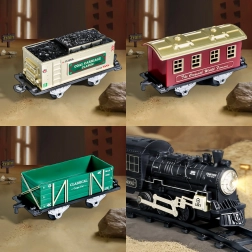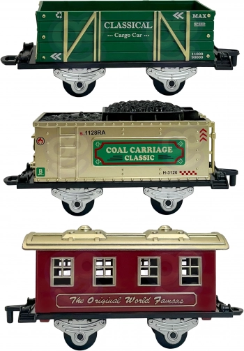 Zestaw zawiera wagon pasażerski, węglarkę i wagon towarowy do tworzenia różnorodnych historii transportowych.