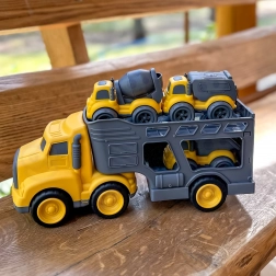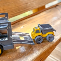 Duży nośnik z rampami umożliwia łatwe załadunki i przewóz wszystkich trzech pojazdów. Stabilna konstrukcja sprosta nawet intensywnej dziecięcej zabawie.