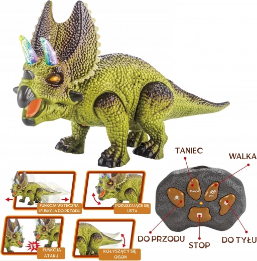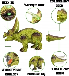 - Dinozaur porusza się do przodu i do tyłu, naśladując chód prawdziwego Triceratopsa