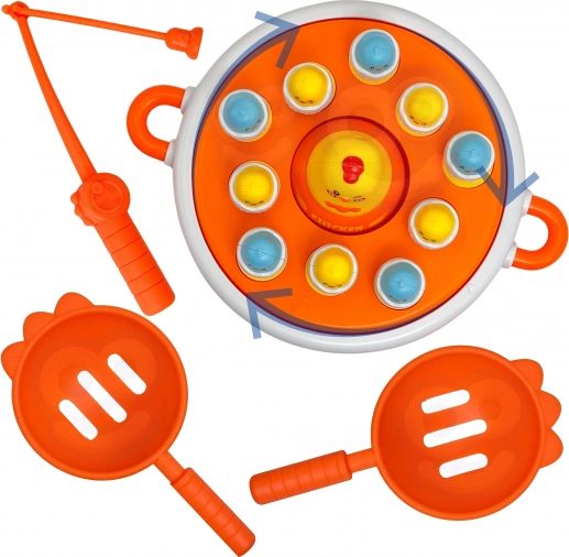 - 4w1 zabawa: łowienie wędką, katapulta z łapaniem, muzyczny obrotowy dysk, kurczak–autko