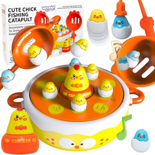 Ta uniwersalna zabawka łączy aż cztery gry w jednym zestawie, więc dzieciom długo się nie znudzi. Obracająca się podstawa z muzyką losowo wysuwa kurczaczki, które można łowić magnetyczną wędką lub łapać łopatkami po ich wystrzeleniu z katapulty. Większy odczepiany kurczak posłuży jako wesołe autko.