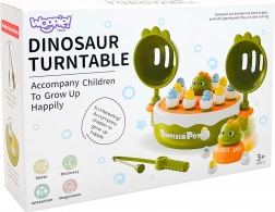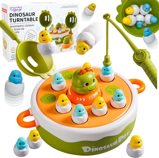 - Dwustronna obrotowa platforma z uchwytami, figurki dino w „jajeczkach”, 1× magnetyczna wędka, 2× łopatka, dino–autko, opakowanie prezentowe
