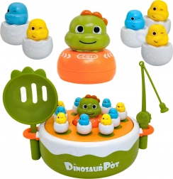 Podstawa do gry z uchwytami jest kompaktowa i gotowa do szybkiej akcji: dzieci mogą łowić dino–pisklęta za pomocą magnetycznej wędki lub je wystrzeliwać katapultą i łapać łopatkami. Na drugiej stronie podstawy znajdą kółko i krzyżyk do spokojniejszej rywalizacji, a duże, urocze dino–autko doda kolejny wymiar fantazyjnej zabawy.