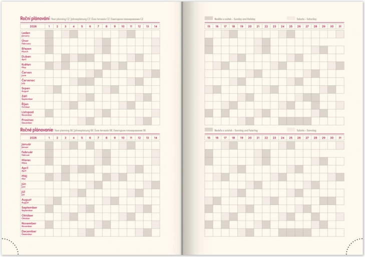 Nowoczesny i elegancki terminarz z tygodniowym układem w kalendarzu czesko-słowackim. Wyposażony w solidną gumkę i uchwyt na długopis.