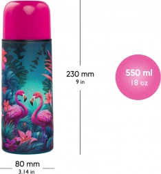 Termobutelka Flamingi marki BAAGL została zaprojektowana dla nowego pokolenia uczniów. Z pojemnością 550 ml i wagą 367 g idealnie mieści się w plecakach i tornistrach. Specyfikacja obejmuje: