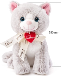 Kotka Jacqueline nosi czerwone serduszko na szyi i jest doskonale przytulna. Idealna dla dzieci od urodzenia, przynosząc wiele radości i możliwości zabawy.