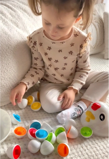 Kolorowe kurczątko–sorter marki WOOPIE to multifunkcyjna zabawka edukacyjna, która rozwija u dzieci kluczowe umiejętności poprzez zabawę. Zawiera zestaw zabawek w kształcie jajek, które dziecko musi prawidłowo umieścić w odpowiednich otworach, ucząc się rozpoznawania kształtów i kolorów oraz rozwijając sprawność manualną.