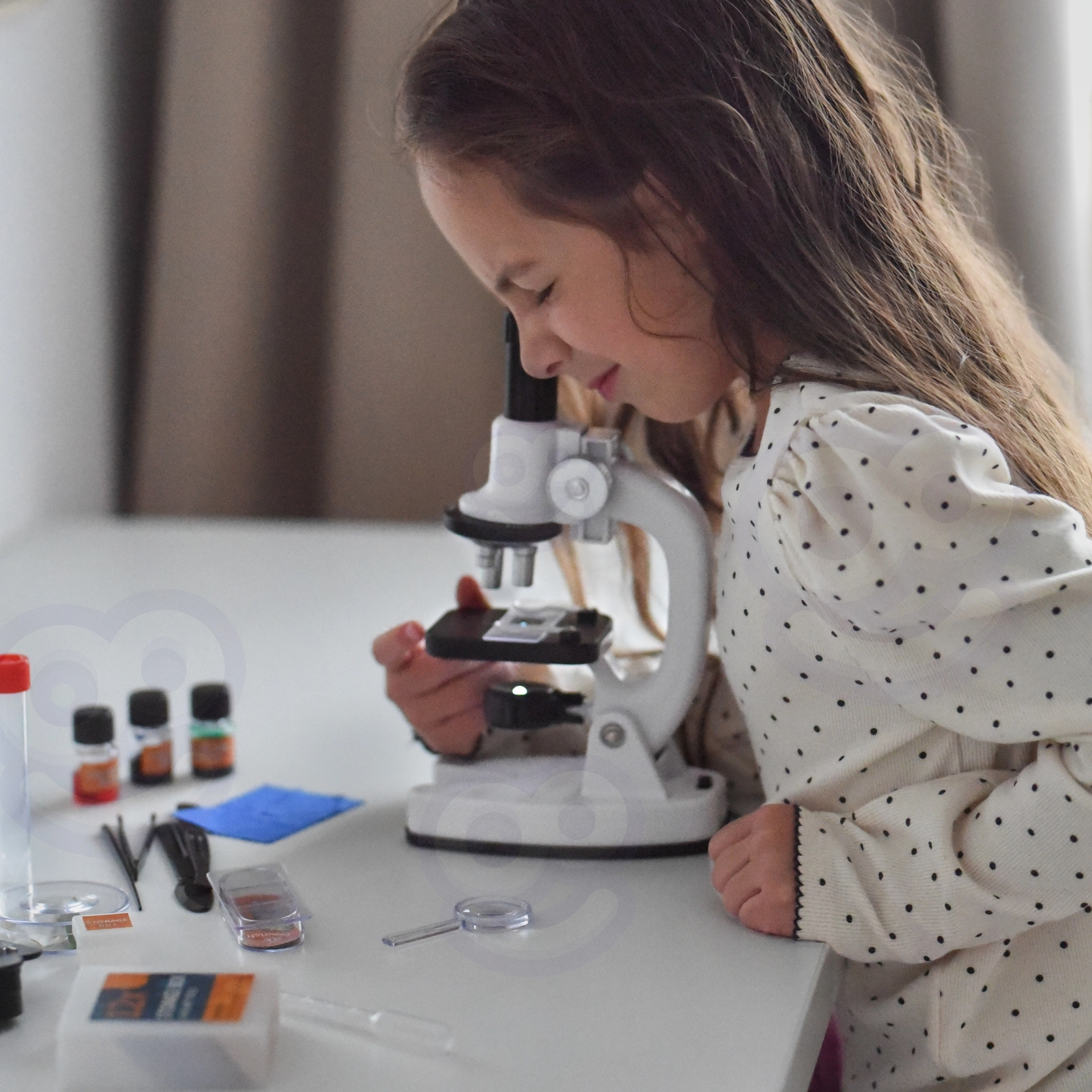W zestawie znajduje się adapter do smartfona, więc można wygodnie robić zdjęcia i udostępniać obserwacje. Bogaty pakiet akcesoriów (szkiełka, buteleczki, pęseta, pipeta i inne) wspiera bezpieczne i angażujące eksperymenty, rozwijając umiejętności naukowe, cierpliwość oraz koordynację ręka–oko.