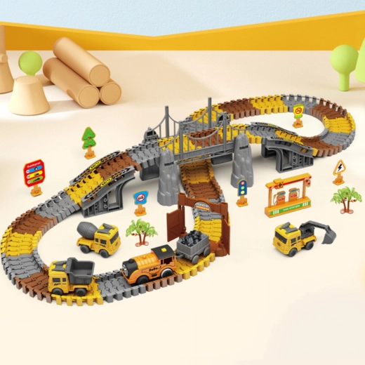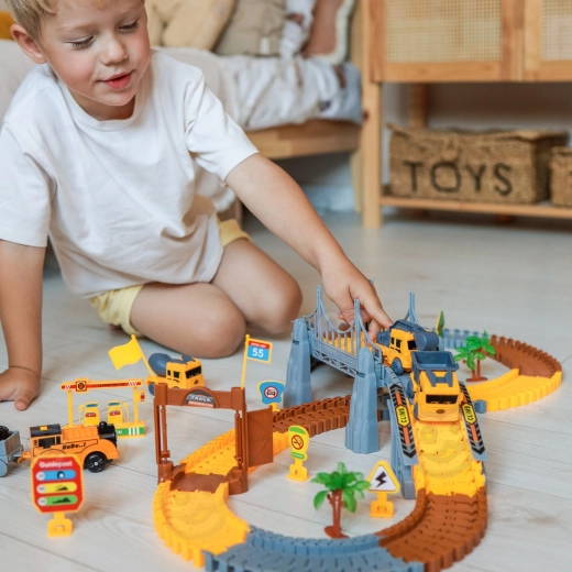Ta duża konstrukcyjna układanka łączy świat pociągów i toru wyścigowego w jeden, pełen frajdy zestaw. Dzięki elastycznym, wzajemnie zatrzaskiwanym elementom dziecko z łatwością ułoży proste odcinki, zakręty, podjazdy i mosty. O realistyczną atmosferę dbają maszyny budowlane, bramy, znaki i inne dekoracje, które pobudzają wyobraźnię i samodzielną zabawę.