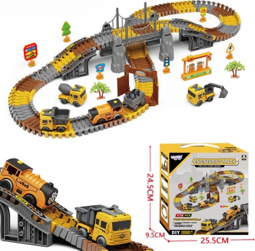 W komplecie jest lokomotywa z napędem do przewożenia „ładunku”, małe pojazdy do pracy na budowie oraz bogaty zestaw dodatków. Montaż jest intuicyjny i stabilny, więc dzieci mogą wielokrotnie przebudowywać trasę i testować nowe warianty. Baterie w zestawie, więc zabawa może zacząć się od razu.
