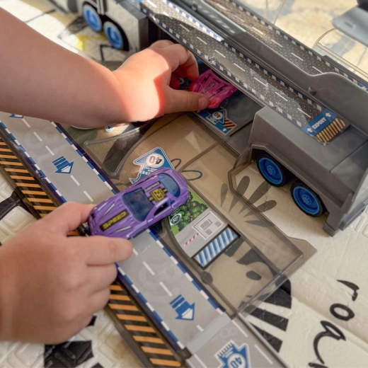 Kamion działa jako mobilny transporter oraz przenośna walizka na autka i akcesoria. Dzieci z łatwością zabiorą cały zestaw ze sobą.