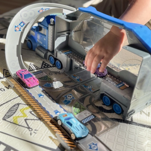 Duży policyjny kamion marki WOOPIE w mgnieniu oka zmienia się z zestawu transportowego dla autek w pełnoprawny zestaw wyścigowy z garażem i torem. Po otwarciu naczepy odsłania się wewnętrzna strefa zabawy z rampami, pętlami i znakami, gdzie dzieci mogą organizować emocjonujące wyścigi i pojedynki.