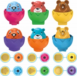 W zestawie znajduje się sześć kolorowych jajeczek, wewnątrz których znajdziesz wesołe zwierzątka. Zadaniem dziecka jest nie tylko otworzyć jajeczko, ale przede wszystkim dopasować je do właściwego miejsca w specjalnym organizerze. Każde jajeczko ma w dolnej części unikalny kształt geometryczny, który odpowiada jednemu otworowi w opakowaniu. Po naciśnięciu figurki zwierzątka słychać efekt dźwiękowy. Wesołe buźki umieszczone na skorupkach to świetny sposób, by nauczyć dzieci rozpoznawania i nazywania emocji.