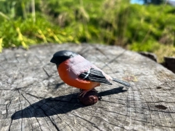 Precyzyjne ręczne malowanie podkreśla autentyczne barwy gila – od intensywnej pomarańczowej po kontrastujące czarne i szare tony.