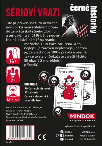 Zanurz się w świecie prawdziwej zbrodni z edycją Czarne historie: Seryjni mordercy – zestawem 50 mrożących krew w żyłach spraw inspirowanych rzeczywistością. Gracze wspólnie odkrywają przerażające zagadki, zadając sprytne pytania i krok po kroku odtwarzając, co naprawdę się wydarzyło. Idealna na imprezy, długie wieczory oraz dla miłośników kryminałów i true crime.