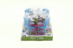 Ten zestaw mebli dla lalek wprowadzi do świata zabawy piękny stoliczek z krzesłami i drobnymi dodatkami. Dzięki kompaktowemu rozmiarowi 12 cm idealnie pasuje do mniejszych lalek i domków. Lekkie, plastikowe wykonanie jest trwałe i łatwe w utrzymaniu.