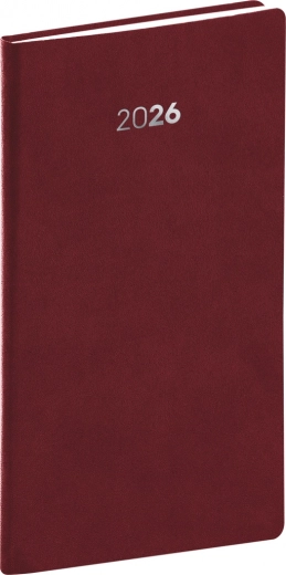 Planowanie kieszonkowy kalendarz Balakon 2026 jest dostępny w eleganckim kolorze bordo. Jego powierzchnia jest znana z wysokiej jakości i wytrzymałego materiału, który zapewnia długą żywotność.