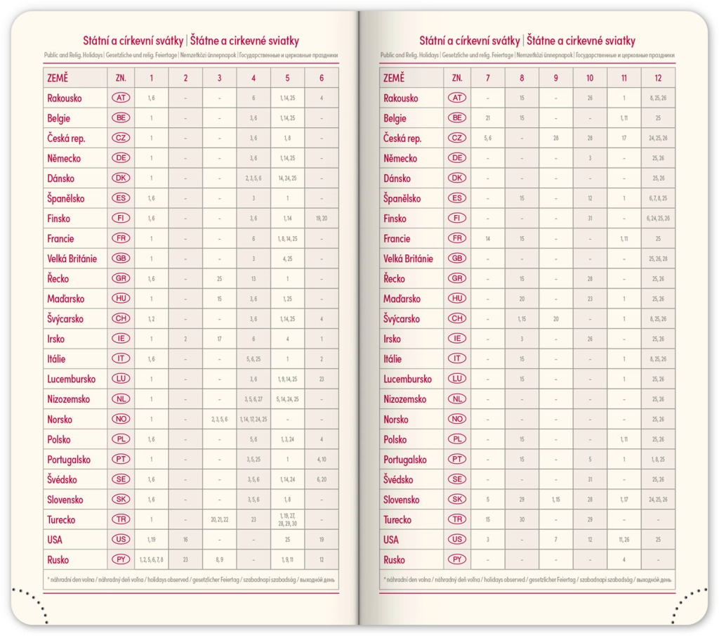 - Układ tygodniowy z kalendarium czesko-słowackim uzupełnionym o język angielski, niemiecki, węgierski i rosyjski.