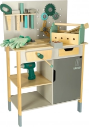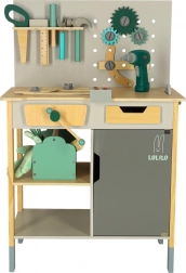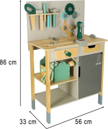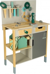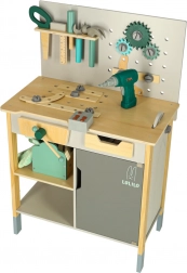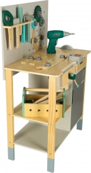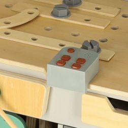 Wartość edukacyjna: Odpowiednie do użytku w domu lub w szkole, gdzie szeroki wybór narzędzi umożliwia nieskończone scenariusze zabaw. Częściami zestawu są m.in. blat, piła, śrubokręt, młotek i wiele innych, w tym pilot z efektami dźwiękowymi.