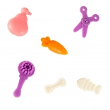 Wyposażenie zestawu obejmuje zabawki fryzjerskie oraz zabawkowe jedzenie, takie jak miski, szynka, kość, rybka i marchewka. Wszystkie części są wykonane z bezpiecznego plastiku i przeznaczone dla dzieci powyżej trzech lat.