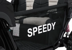 Szerokie, dwuosobowe siedzisko z ekoskóry z pasami bezpieczeństwa zapewnia stabilne i wygodne miejsce dla dwojga dzieci podczas każdej przejażdżki.