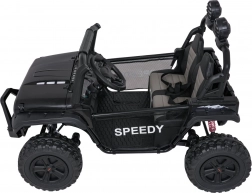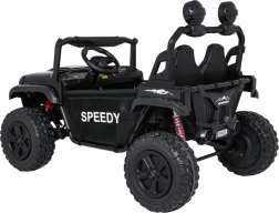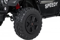 Rodzice docenią zdalne sterowanie 2,4 GHz z trzema prędkościami i bezpieczeństwem przyciskiem Stop. Praktyczny tylny boks 49 × 10 × 16 cm pomieści drobiazgi na wycieczkę. Wskaźnik naładowania kontroluje energię dwóch akumulatorów 12 V 10 Ah połączonych w szereg (24 V).