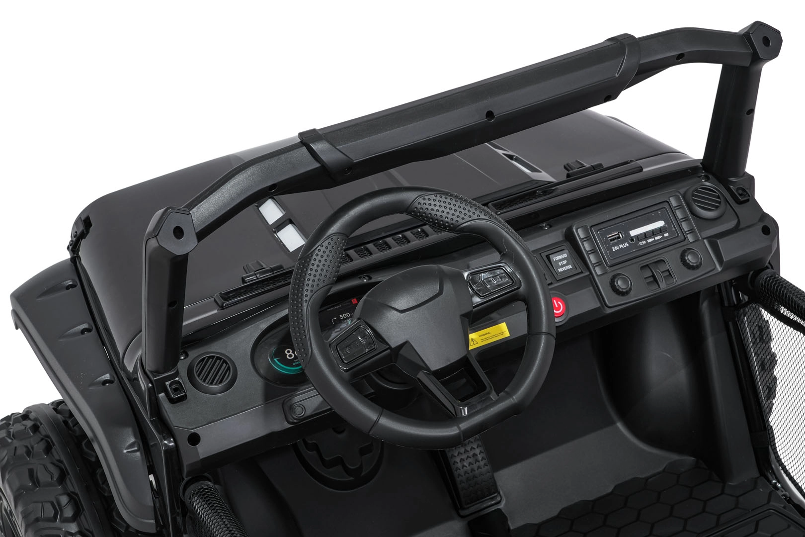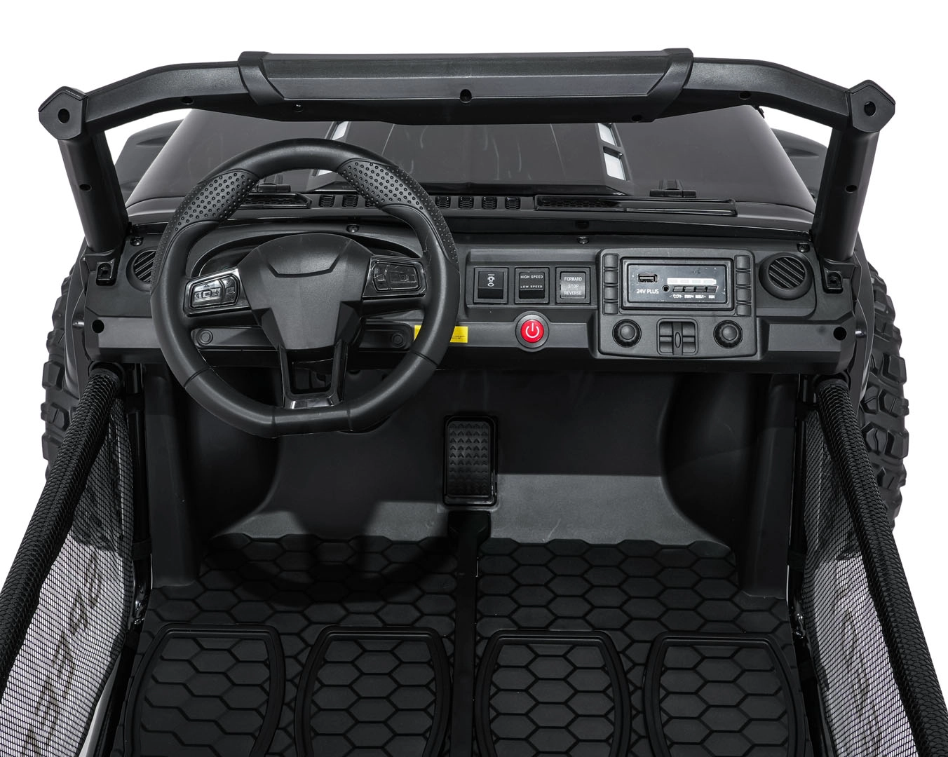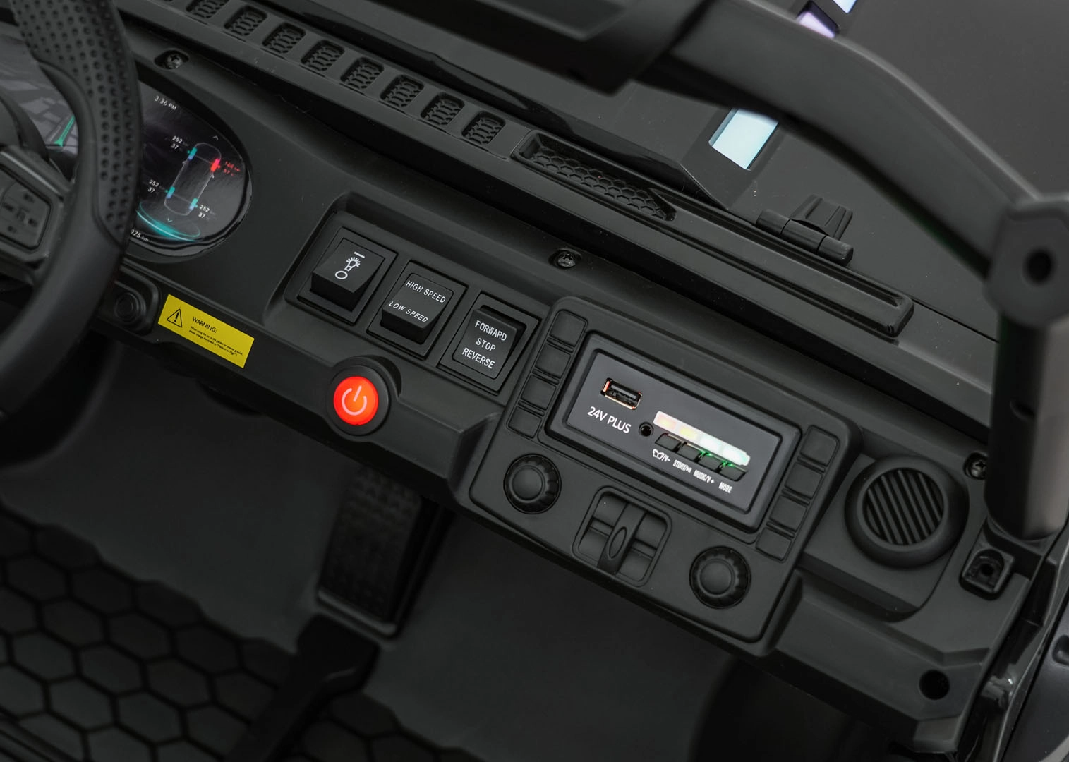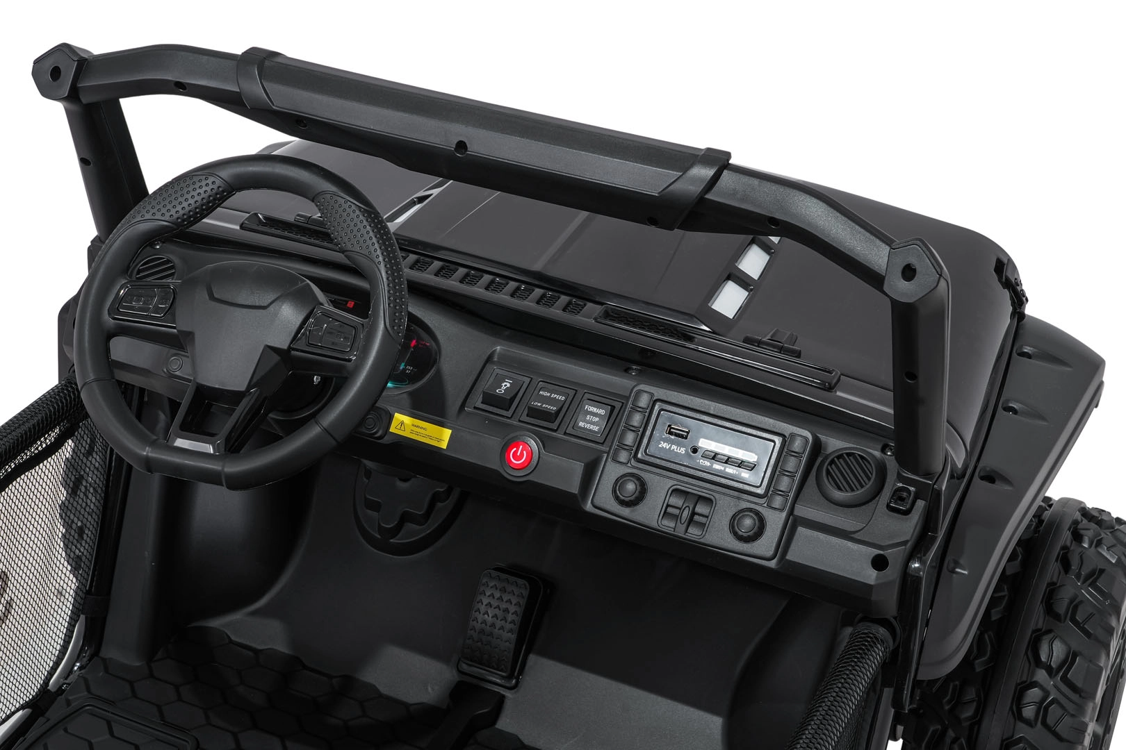 Wnętrze z podwójnym siedziskiem z ekoskóry, pasami bezpieczeństwa i przejrzystą deską rozdzielczą oferuje przestrzeń dla dwojga dzieci. Bogate oświetlenie LED (przednie światła, podświetlana maska oraz przygotowanie pod górny pałąk świetlny na baterie) dodaje stylu i widoczności. Panel multimedialny z USB/AUX/MP3/Bluetooth oraz przyciskami klaksonu na kierownicy zapewnia rozrywkę w trasie.