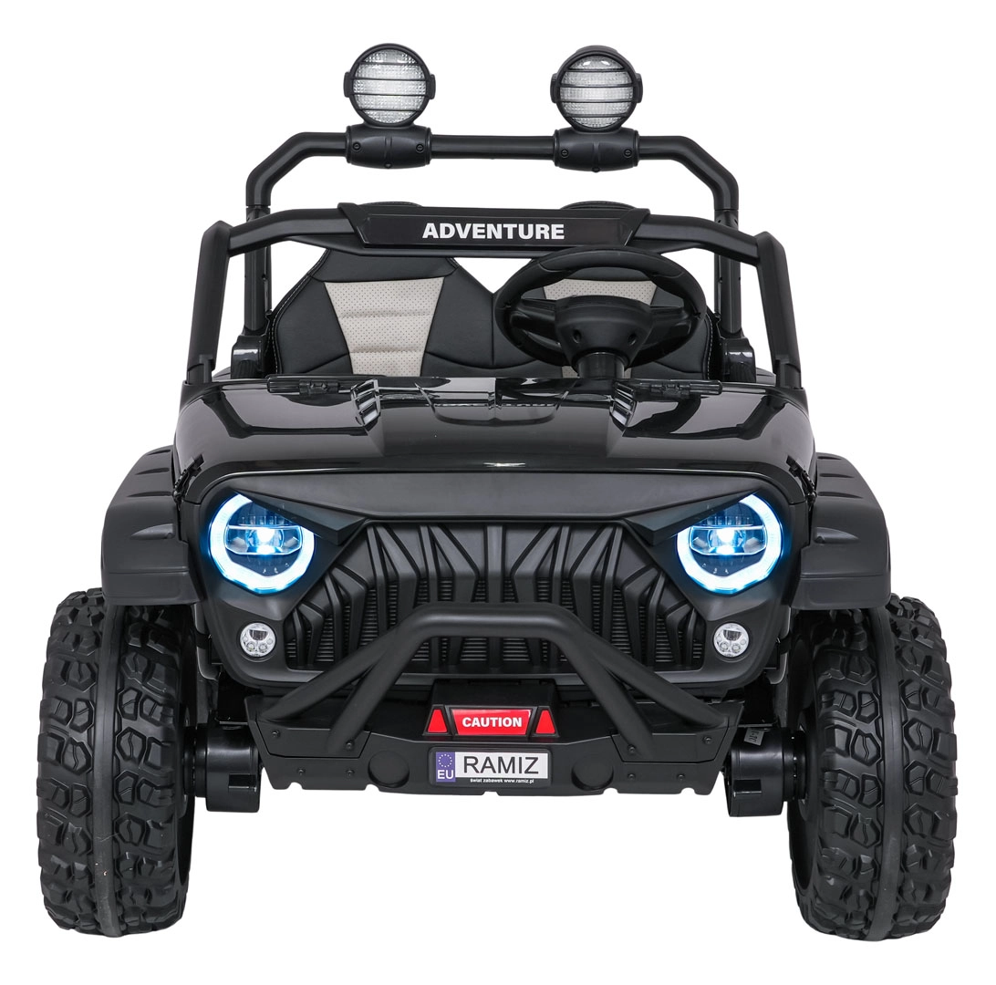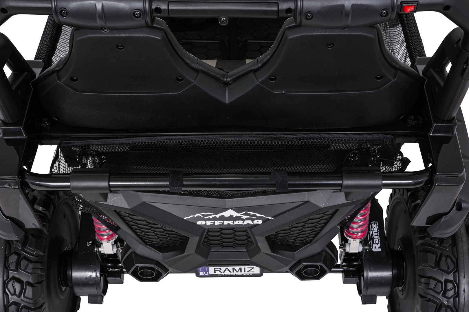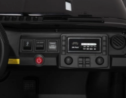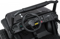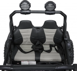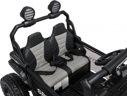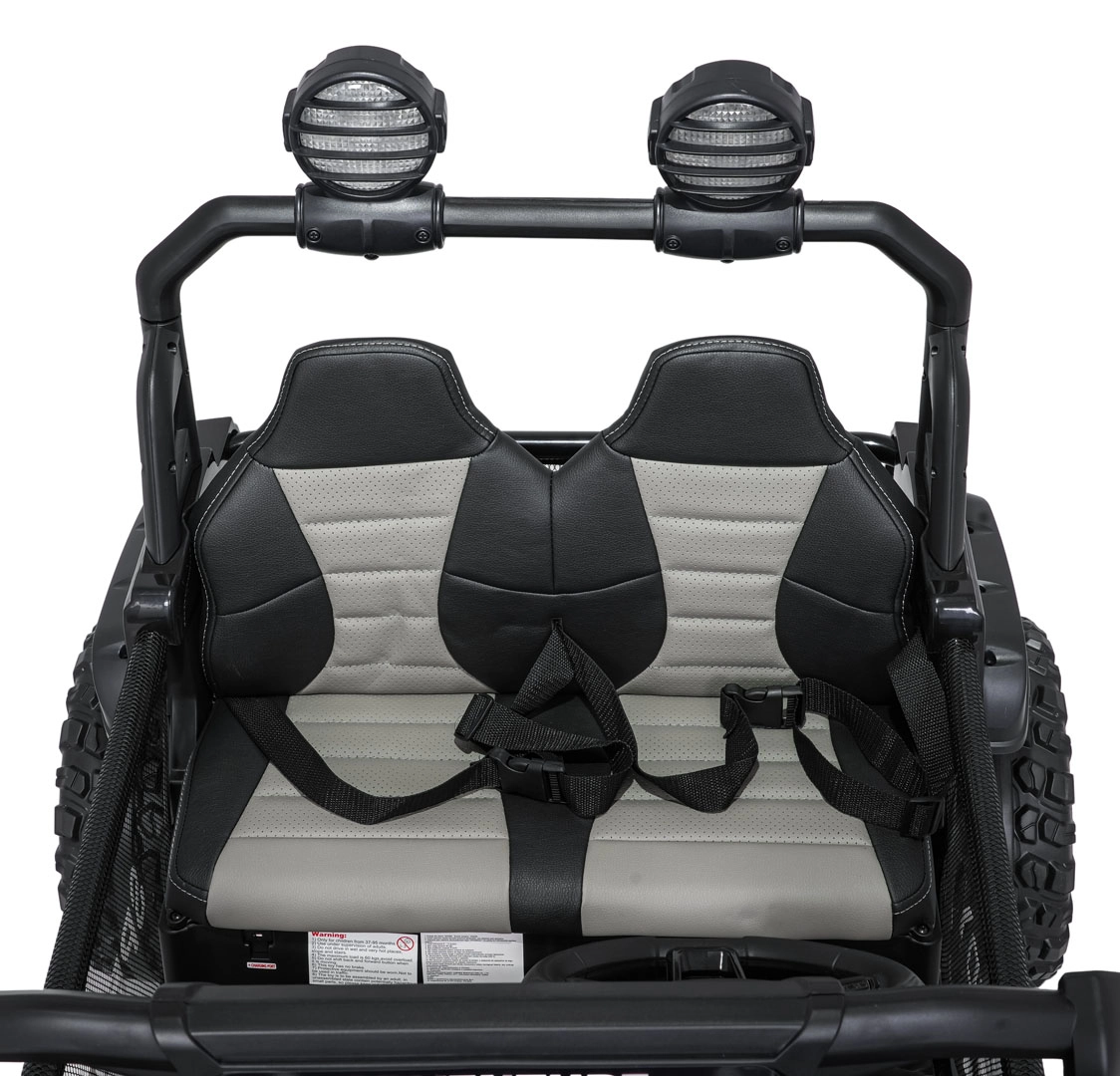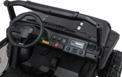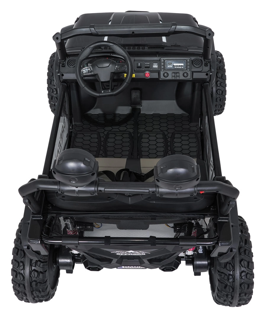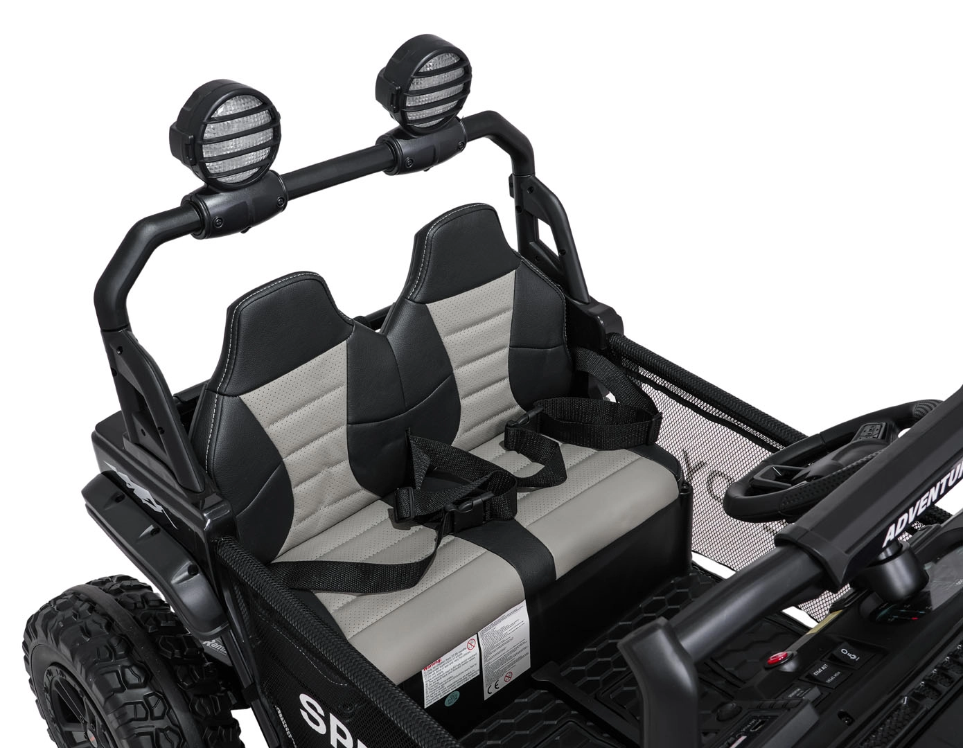 Wnętrze z podwójnym siedziskiem z ekoskóry, pasami bezpieczeństwa i przejrzystą deską rozdzielczą oferuje przestrzeń dla dwojga dzieci. Bogate oświetlenie LED (przednie światła, podświetlana maska oraz przygotowanie pod górny pałąk świetlny na baterie) dodaje stylu i widoczności. Panel multimedialny z USB/AUX/MP3/Bluetooth oraz przyciskami klaksonu na kierownicy zapewnia rozrywkę w trasie.
