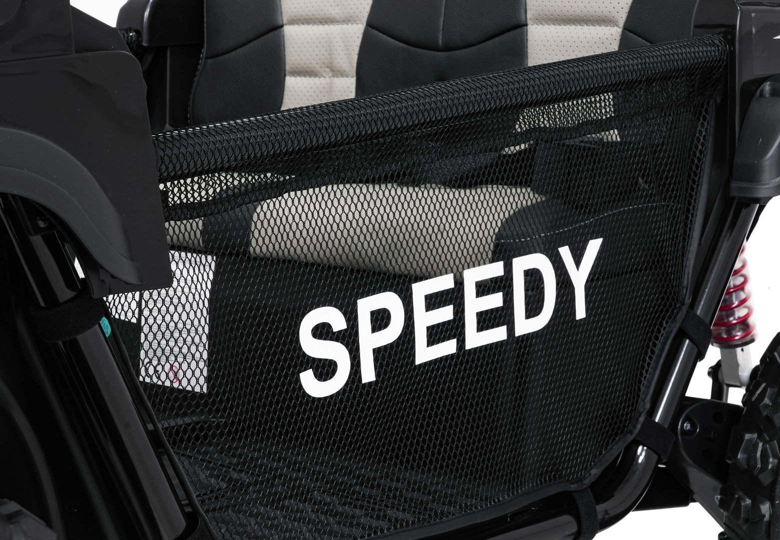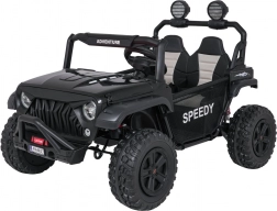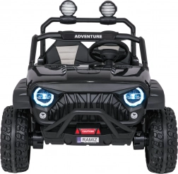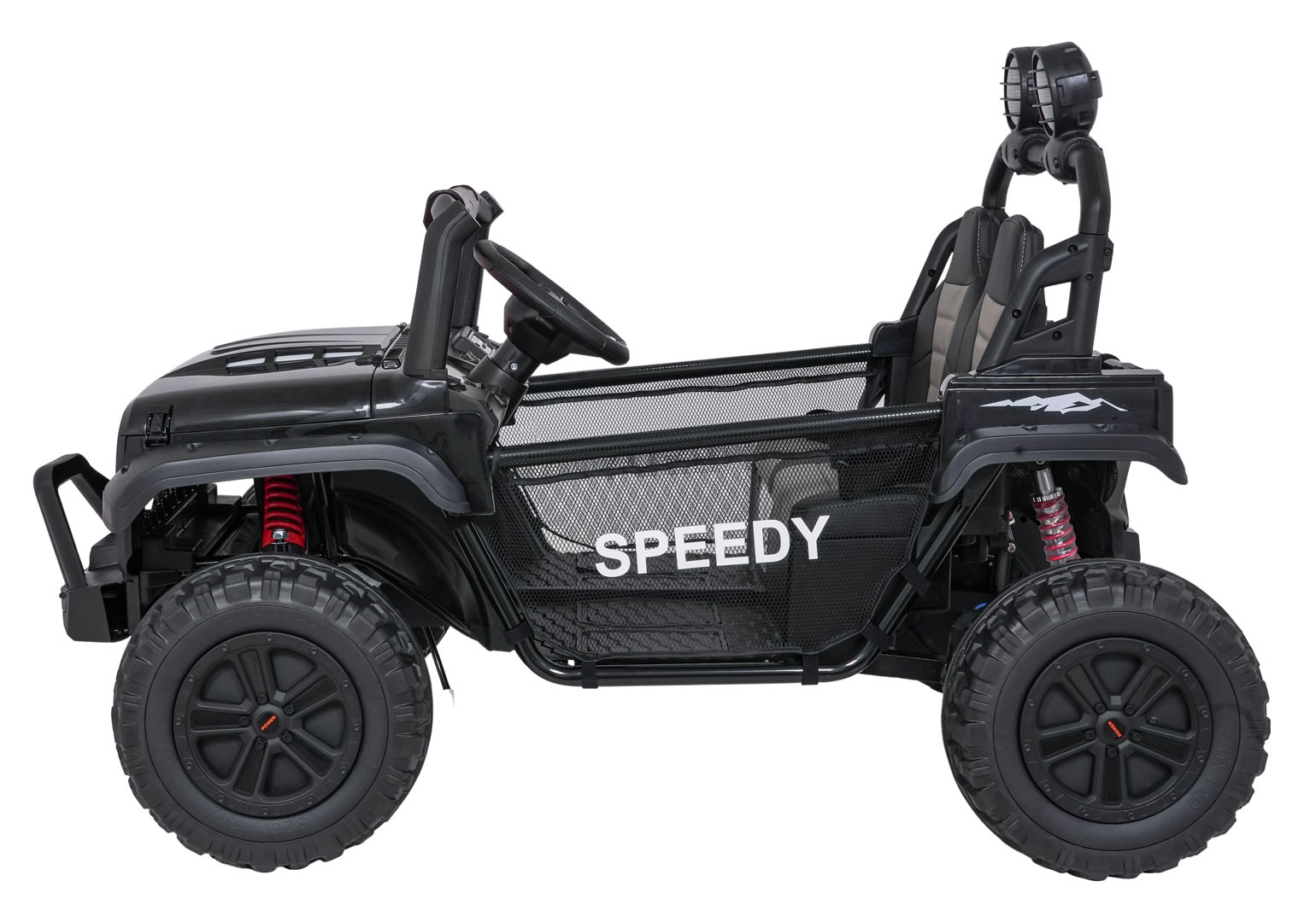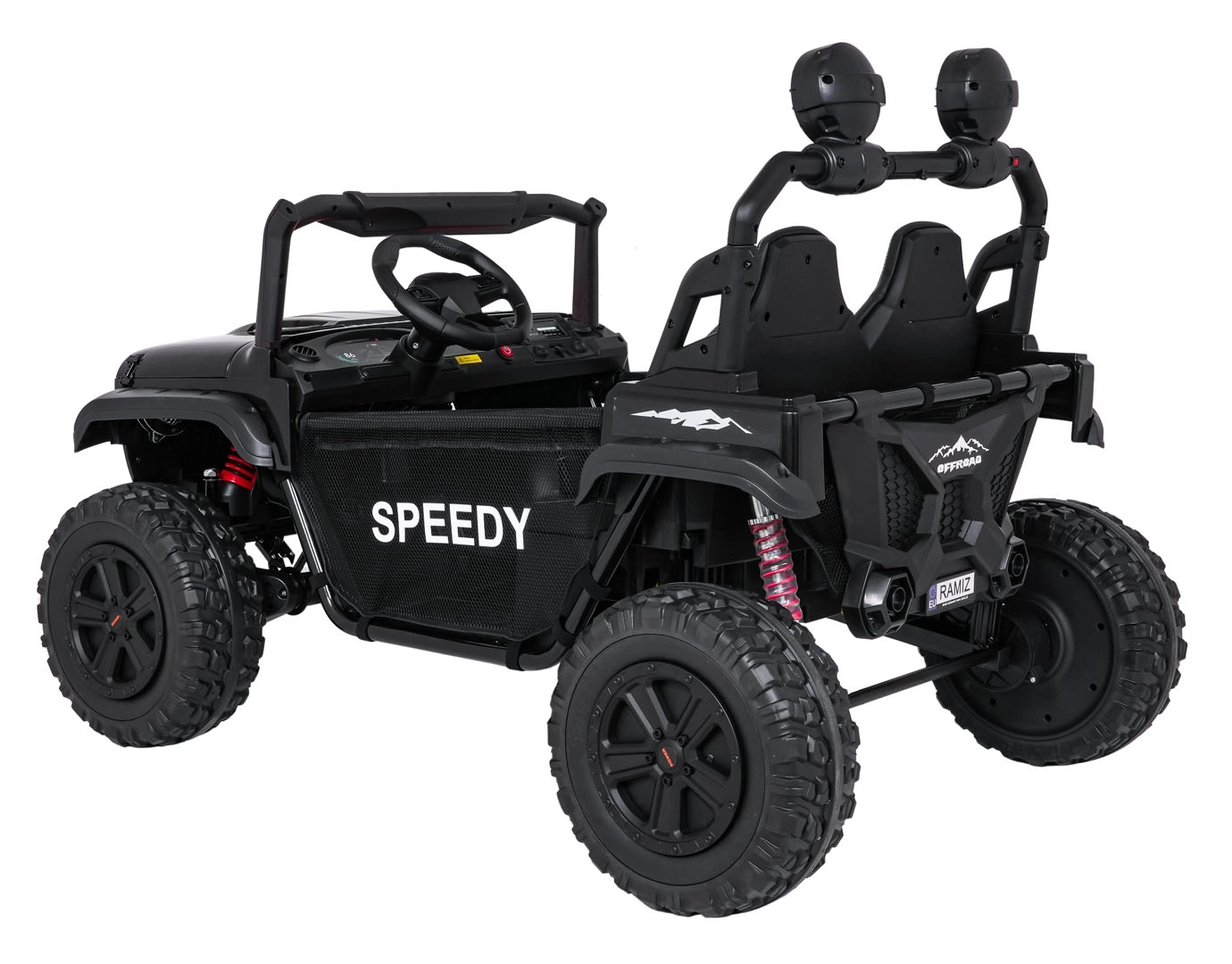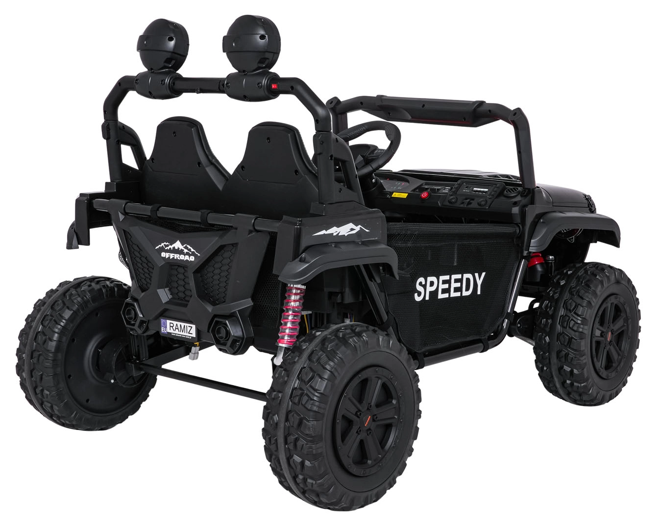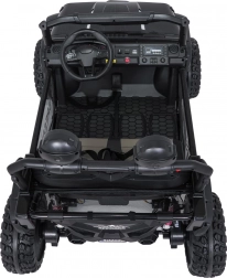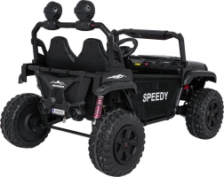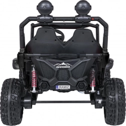 Wnętrze z podwójnym siedziskiem z ekoskóry, pasami bezpieczeństwa i przejrzystą deską rozdzielczą oferuje przestrzeń dla dwojga dzieci. Bogate oświetlenie LED (przednie światła, podświetlana maska oraz przygotowanie pod górny pałąk świetlny na baterie) dodaje stylu i widoczności. Panel multimedialny z USB/AUX/MP3/Bluetooth oraz przyciskami klaksonu na kierownicy zapewnia rozrywkę w trasie.