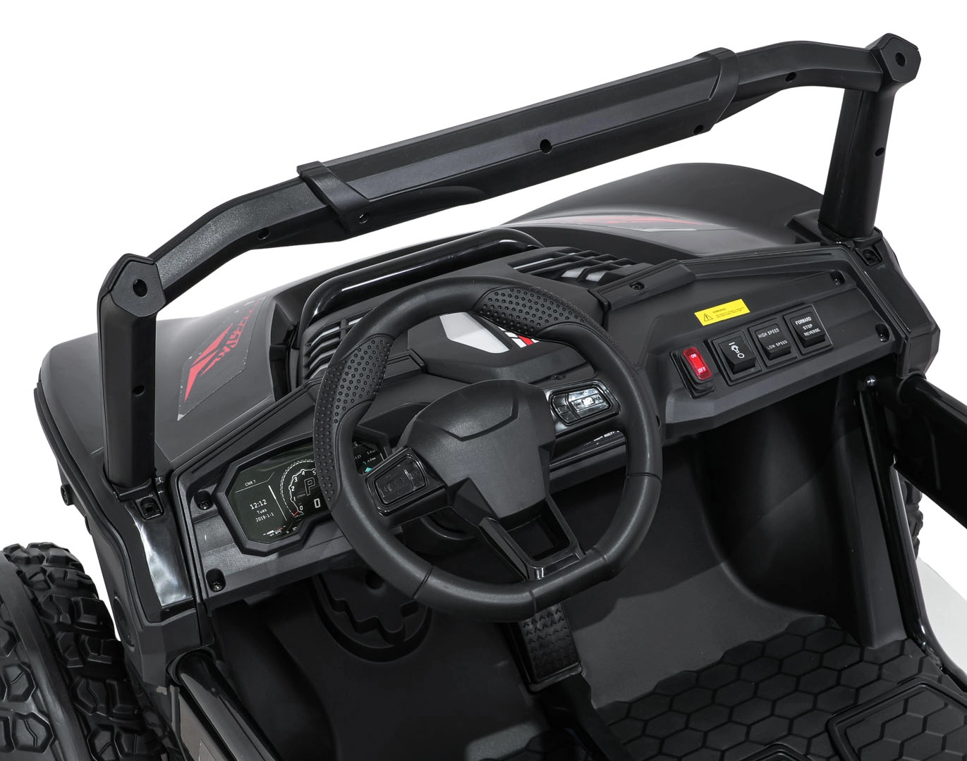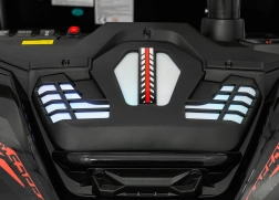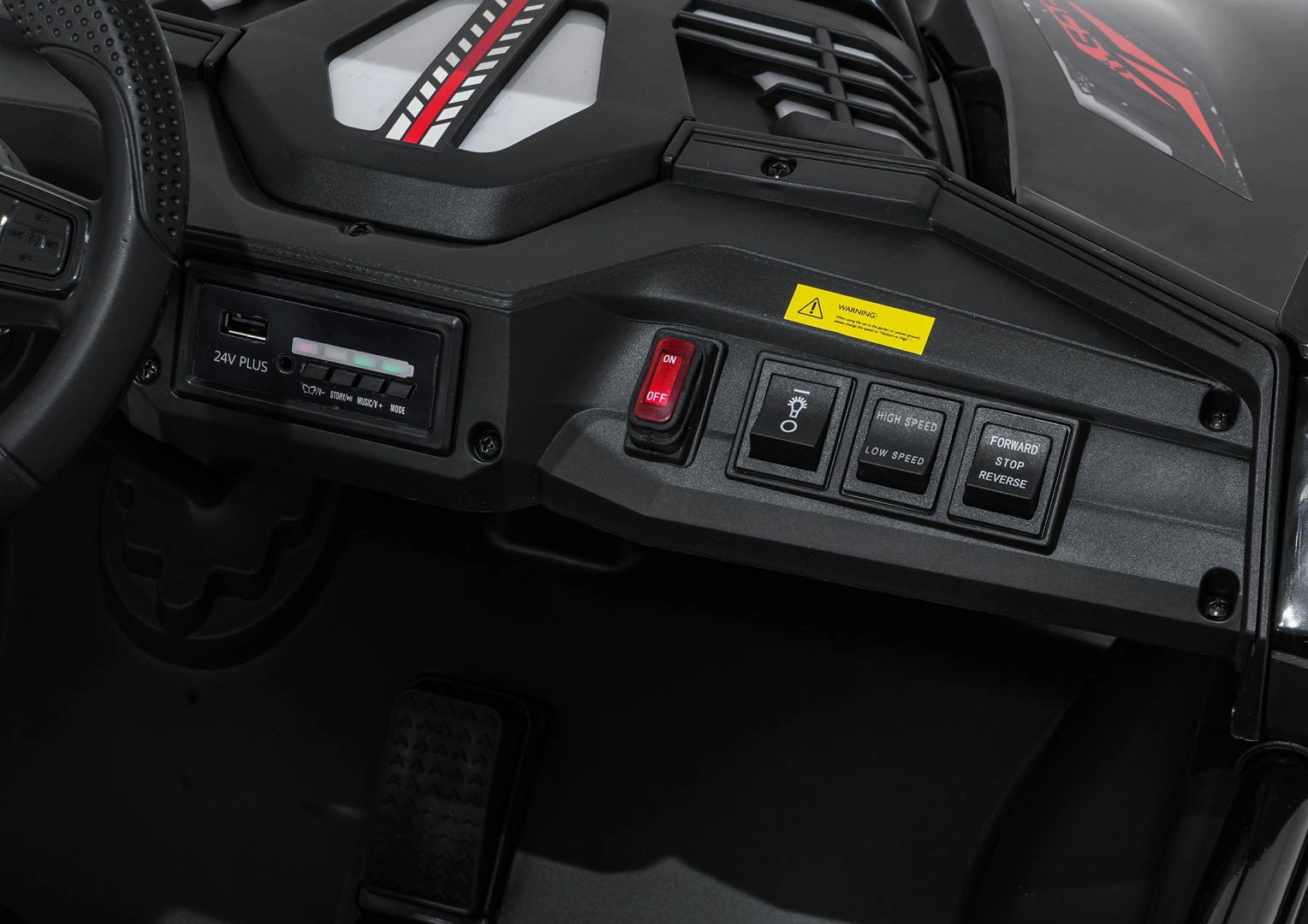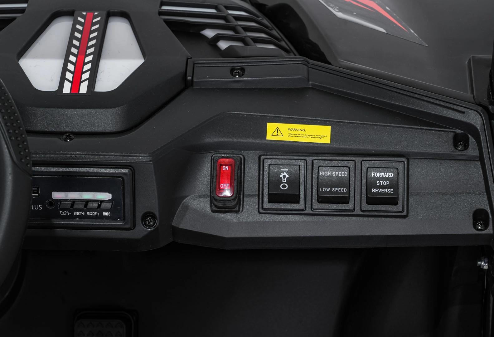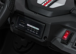 Dla bezpiecznej zabawy nie brakuje płynnego ruszania, biegu wstecznego i dwóch prędkości, przełączanych także przez pilot 2,4 GHz z trzema prędkościami i przyciskiem Stop. Efekt świetlny zapewniają przednie światła LED, podświetlana maska oraz górny pałąk świetlny (zasilany bateriami – brak w zestawie). Panel audio obsługuje MP3, Bluetooth, USB i AUX, a na kierownicy znajdują się dźwięki i klakson oraz wgrane melodie.