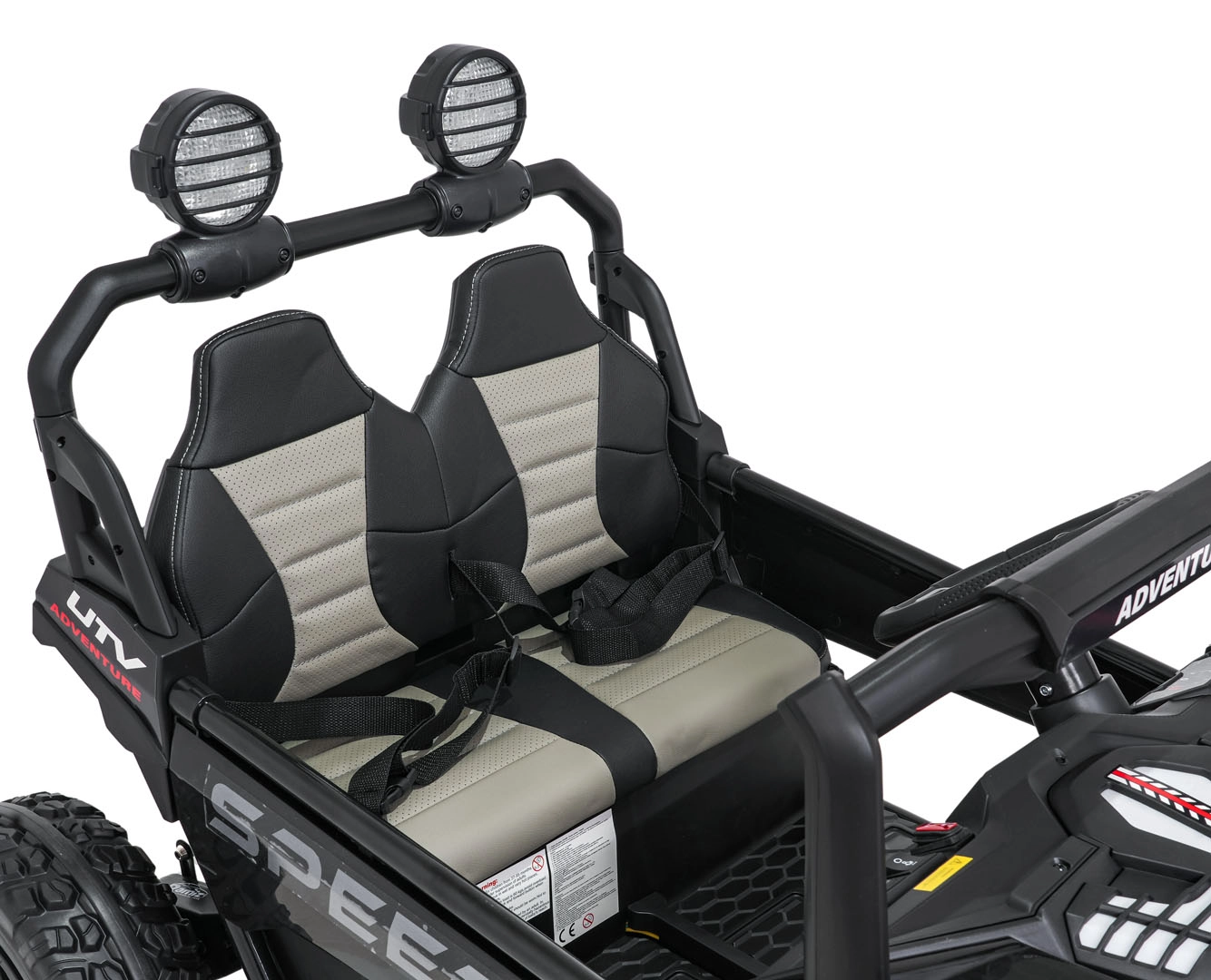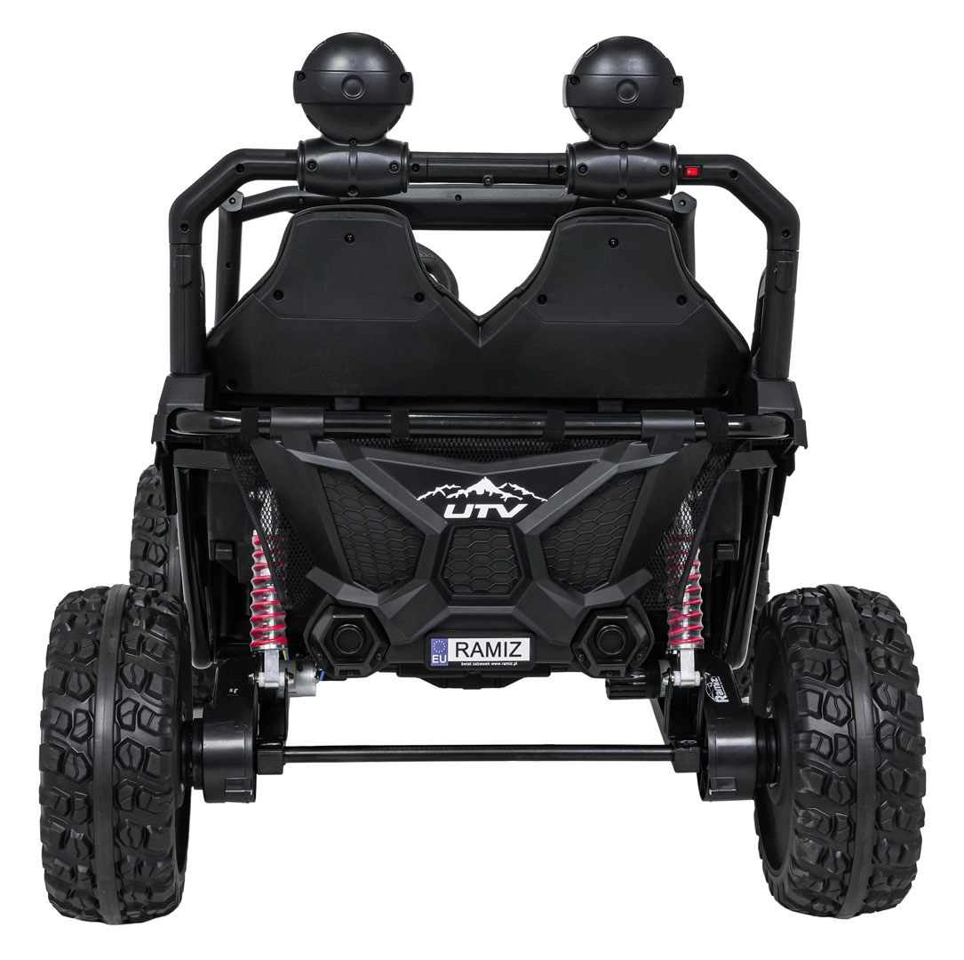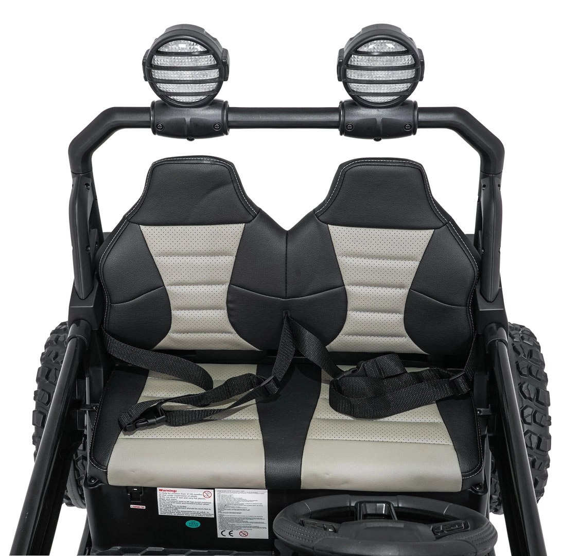Pilot 2,4 GHz z 3 prędkościami i przyciskiem Stop pozwala rodzicom mieć pełną kontrolę nad jazdą. Podwójne siedzisko z pasami bezpieczeństwa trzyma dzieci pewnie i bezpiecznie.