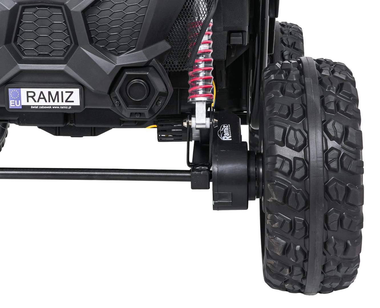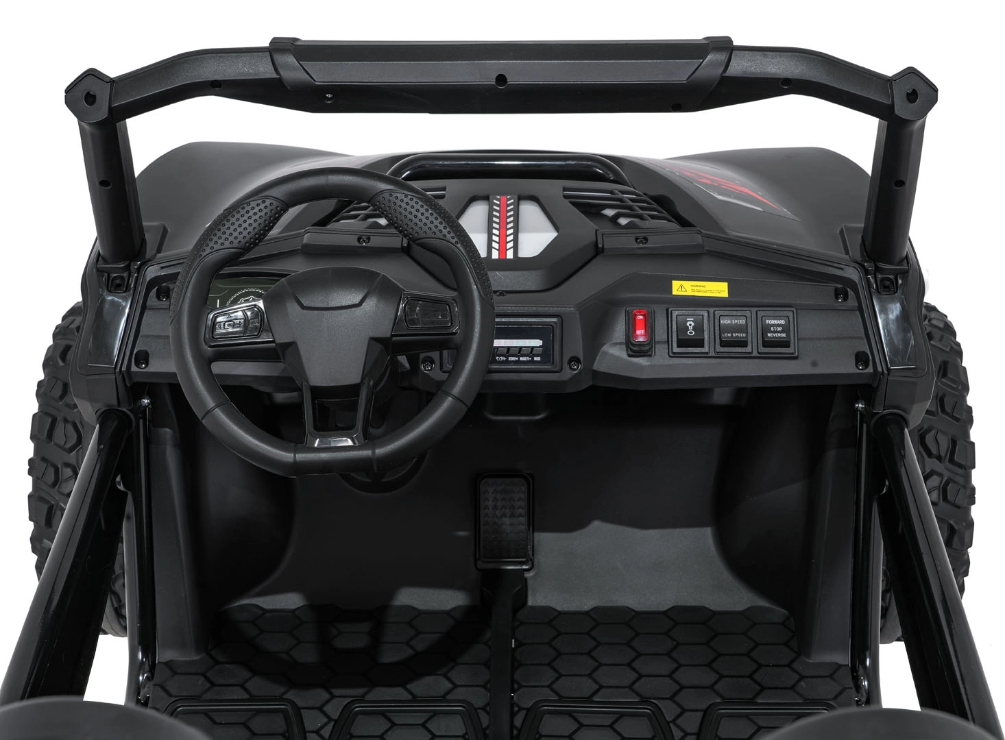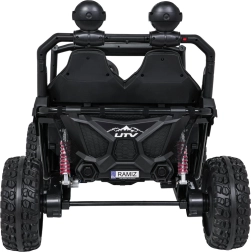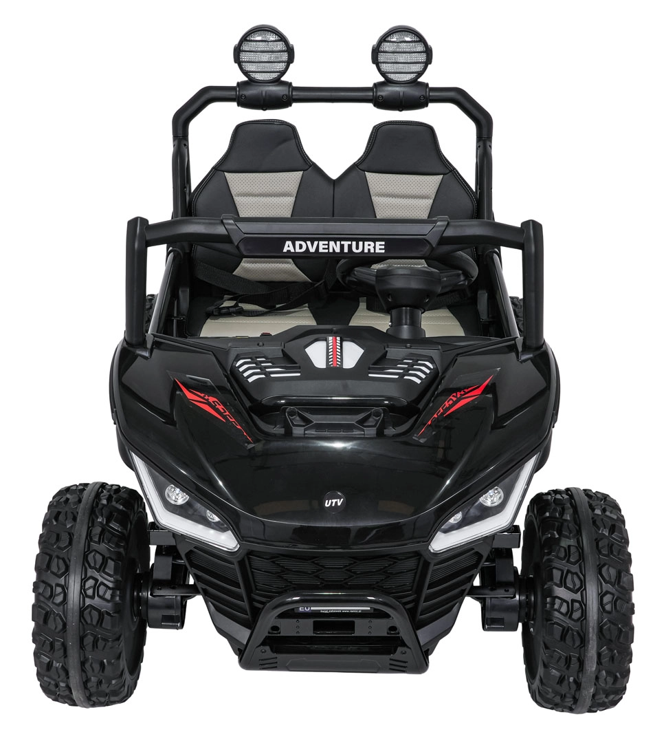 Pilot 2,4 GHz z 3 prędkościami i przyciskiem Stop pozwala rodzicom mieć pełną kontrolę nad jazdą. Podwójne siedzisko z pasami bezpieczeństwa trzyma dzieci pewnie i bezpiecznie.