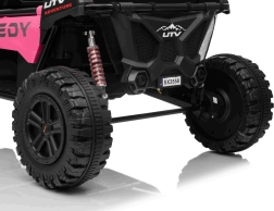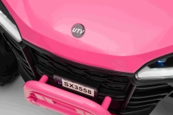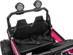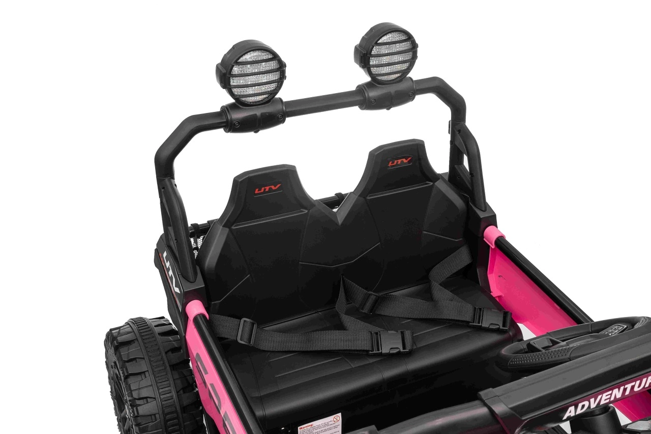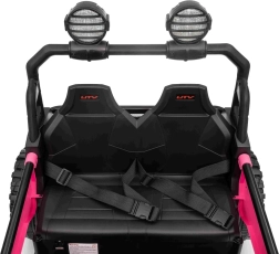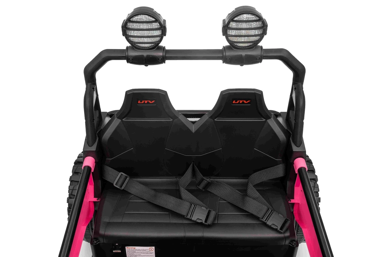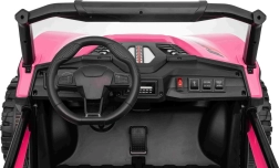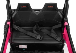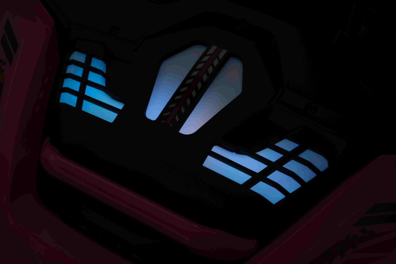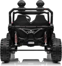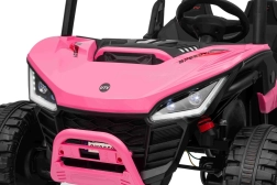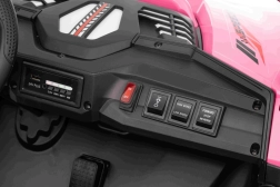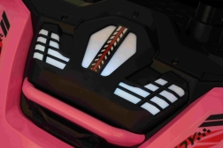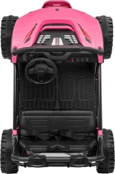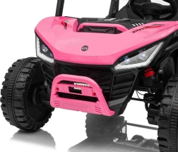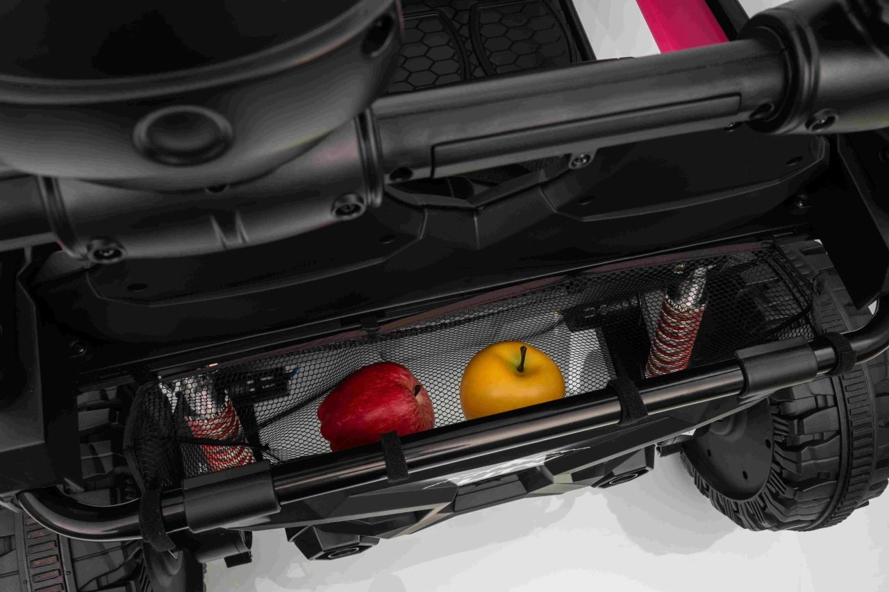 Bezpieczeństwo zapewniają pasy bezpieczeństwa oraz podwójne siedzisko z ekoskóry dla wygodnego siedzenia. Migające światła LED i podświetlana maska dodają prawdziwego efektu wizualnego. Z tyłu pojazdu znajduje się schowek, który pomieści wszystkie skarby małego kierowcy.