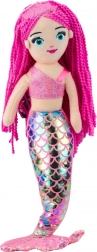 Pluszowa syrena jest wyposażona w efektowny holograficzny ogon przypominający łuski, który pięknie mieni się w świetle i nawiązuje do magicznego podwodnego świata. Ma także długie różowe włosy w formie plecionych sznureczków, które można gładzić i układać, błyszczący top na jedno ramię oraz różową tiarę na głowie.