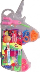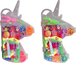 Wszystko jest schludnie zapakowane w praktyczne plastikowe pudełko w kształcie jednorożca, które zawiera mniejsze przegródki do przejrzystego uporządkowania gumek według kolorów. Ten zestaw nie tylko zapewnia zabawę, ale także rozwija dziecięcą kreatywność i zdolności manualne.