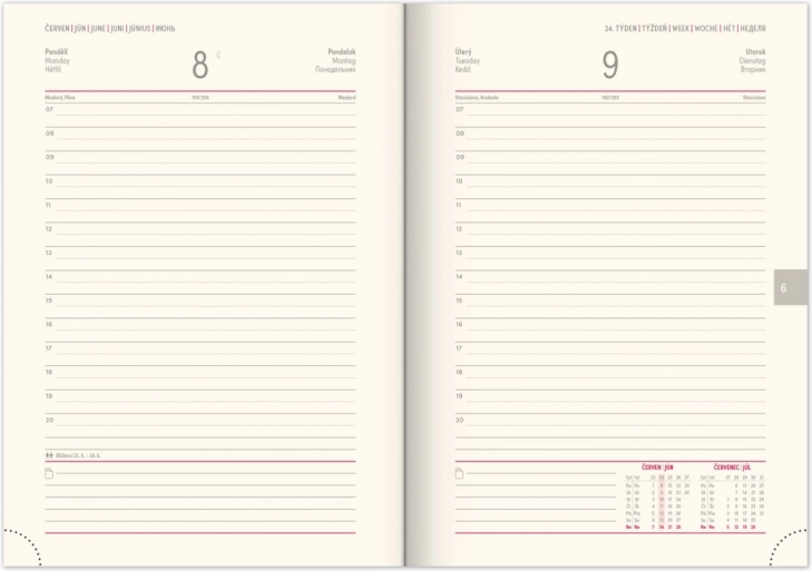 - Układ na każdy dzień z kalendarzem czesko-słowackim oraz dodatkowymi wersjami językowymi w angielskim, niemieckim, węgierskim i rosyjskim.